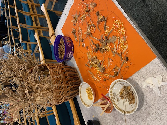 We also used a mixture of different grasses, corn, acorns and sycamore keys to create a fruitful seedy collage in the shape of a pumpkin! When we see these fruits of trees and grasses, we give thanks to God for all we have been given and share as much as we can with others..
